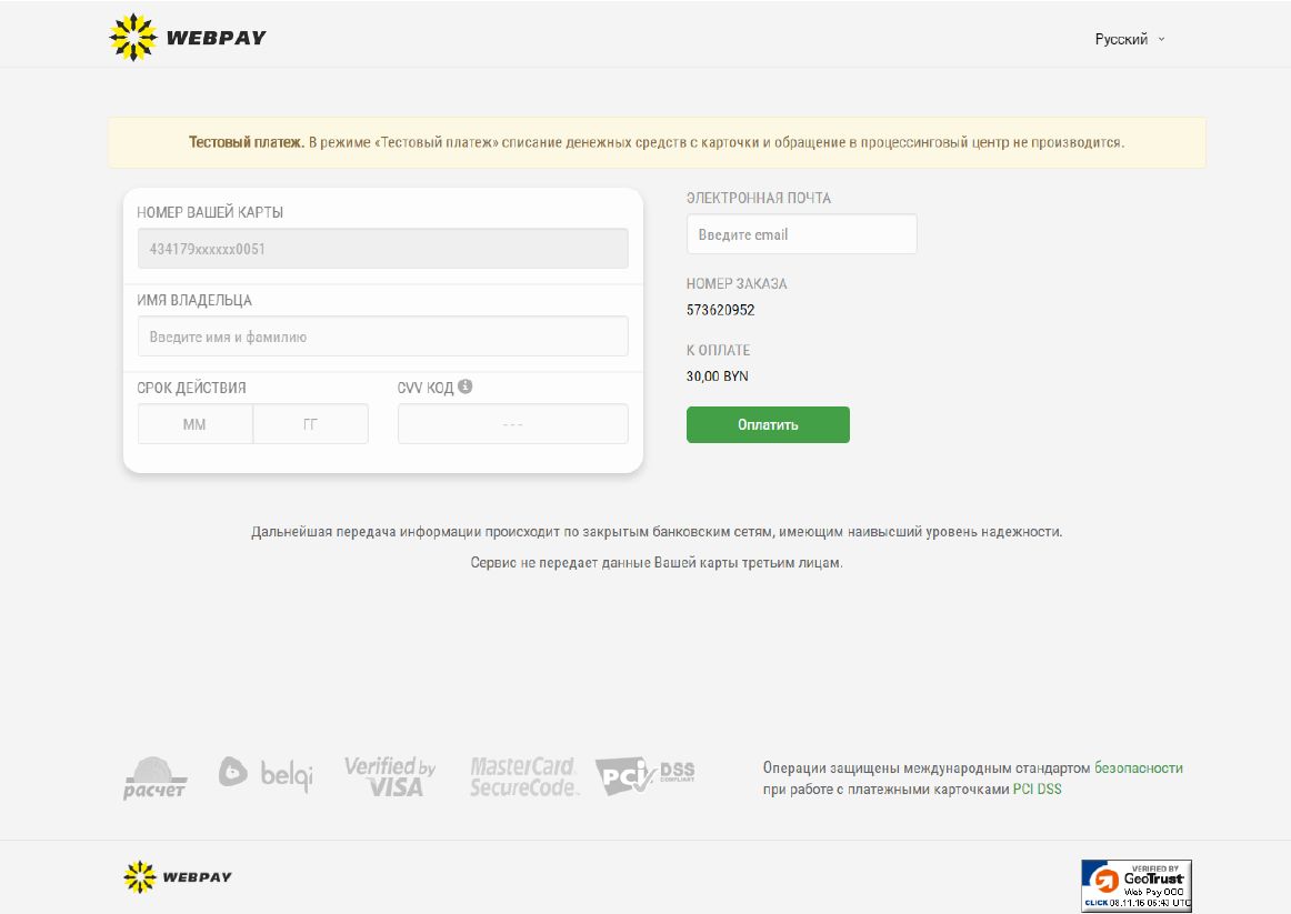 Мы не сохраняем информацию о Ваших данных. Данные своей карточки Вы вводите на сайте WEBPAY™, который предусматривает все необходимые степени защиты информации. Мы являемся официальными партнерами компании ООО «ВЕБ ПЭЙ» и ОАО «Приорбанк».
